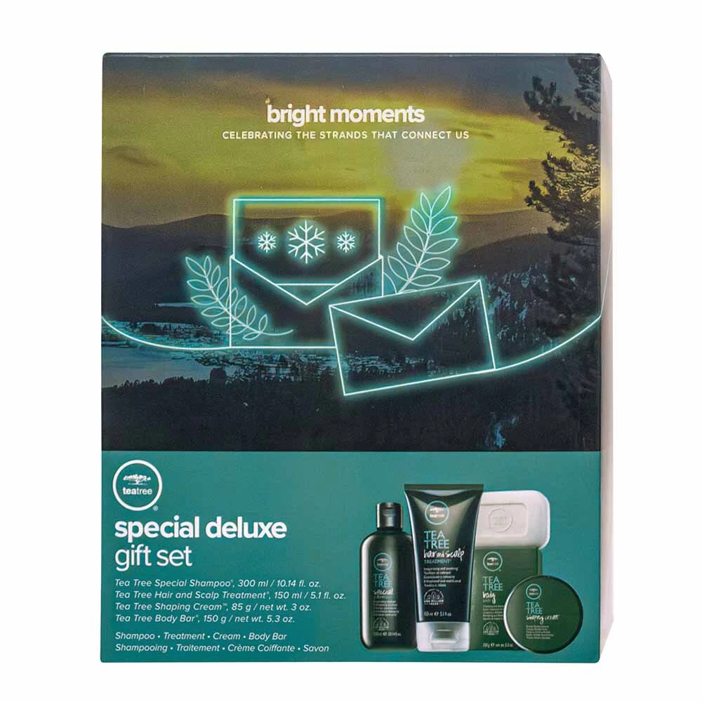 Contains: Tea Tree Special Shampoo 300ml, Tea Tree Special Conditioner 300ml, Tea Tree Body Bar 150g, and Tea Tree Shaping Cream 85g.